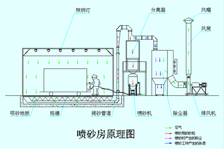 走入式噴砂房?jī)?nèi)外及操作效果展示示意圖