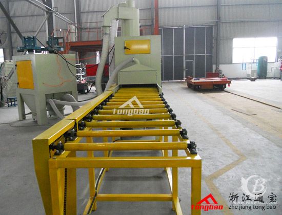 左圖為噴砂處理工件入口輸送滾軸平臺,右圖為設(shè)備內(nèi)部工作艙結(jié)構(gòu)