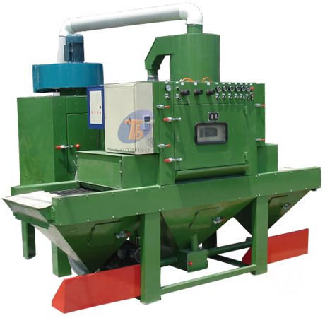 ▓ 原理說明: 采用三角皮帶輸送工件,不會積砂,皮帶速度配合噴砂工藝要求可實現(xiàn)變頻調(diào)速;每支噴槍角度可自由調(diào)節(jié)槍架實現(xiàn)自動變頻搖擺,并可定點噴砂,靈活性強、適用 性廣;采用先進的旋風分離系統(tǒng)配置,粉塵分離效果好,噴砂效率高;采用PLC電氣先進控制系統(tǒng),自動化程度高,穩(wěn)定性好,故障率低;噴嘴采用特制高耐磨硼材料,使用壽命長;獨立的布袋式除塵系統(tǒng),抽塵通風效 果良好;(也可選用;脈沖濾芯式除塵);磨料回收采用螺旋輸送及氣力回收相結(jié)合,回收穩(wěn)定性好。 ▓ 輸送式噴砂機特點: 1,本機在加工時為封閉式,不會污染環(huán)境; 3,可根據(jù)噴砂工件需要,輸送帶速度采用變頻器控速;